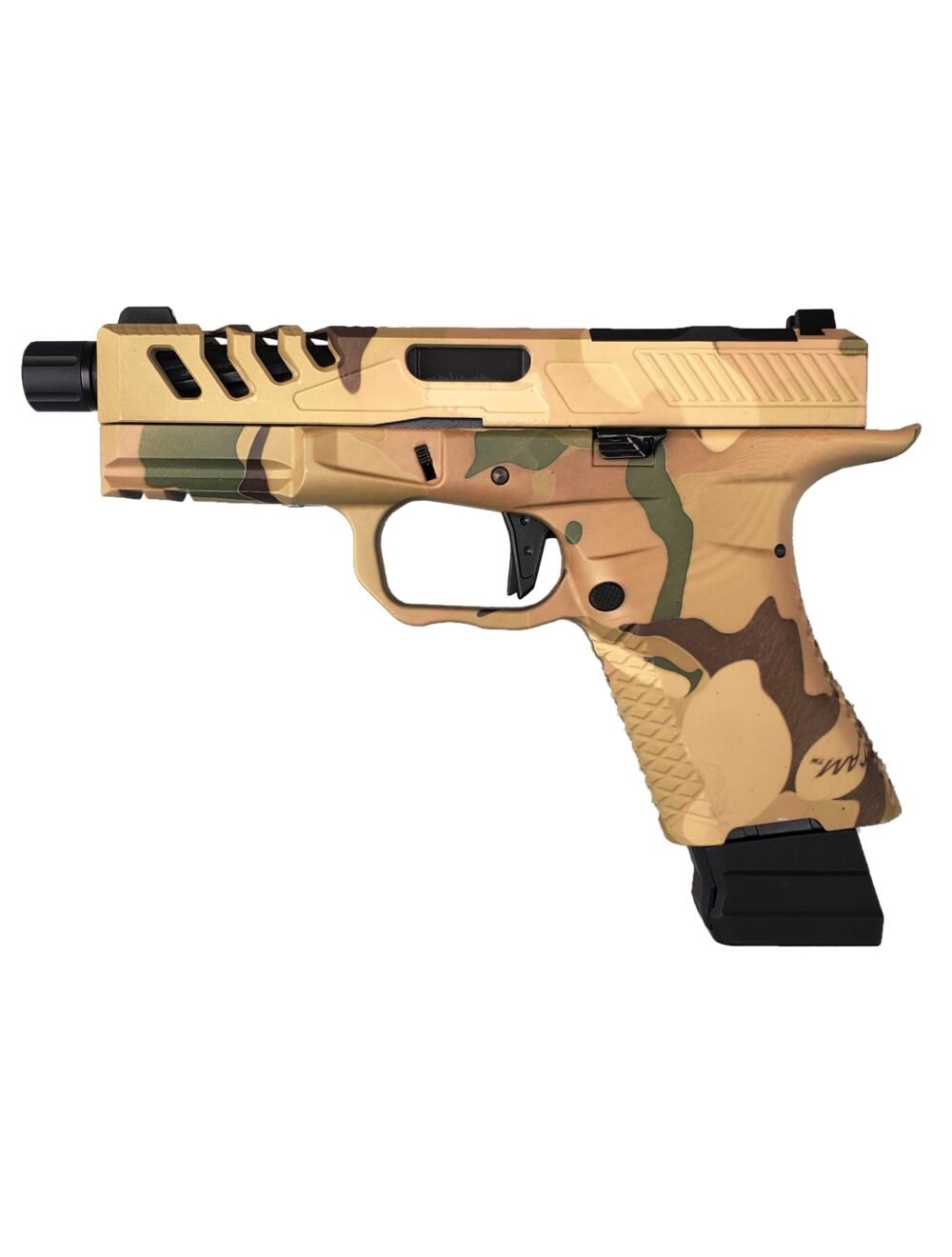 The F1 Firearms BSF19 Gas Blowback Pistol by EMG/F1 in Multi Cam is a new Gas pistol replica! Fully licensed by EMG / F1 Firearms, the handgun features almost full metal construction on both the slide and the frame, with special lightening cuts to reduce overall slide weight and increase cycling speed. This replica also comes optic ready with a built in RMR footprint on top, perfect for small doctor style red dots. It also features a Twisted style outer barrel with silencer adapter included.