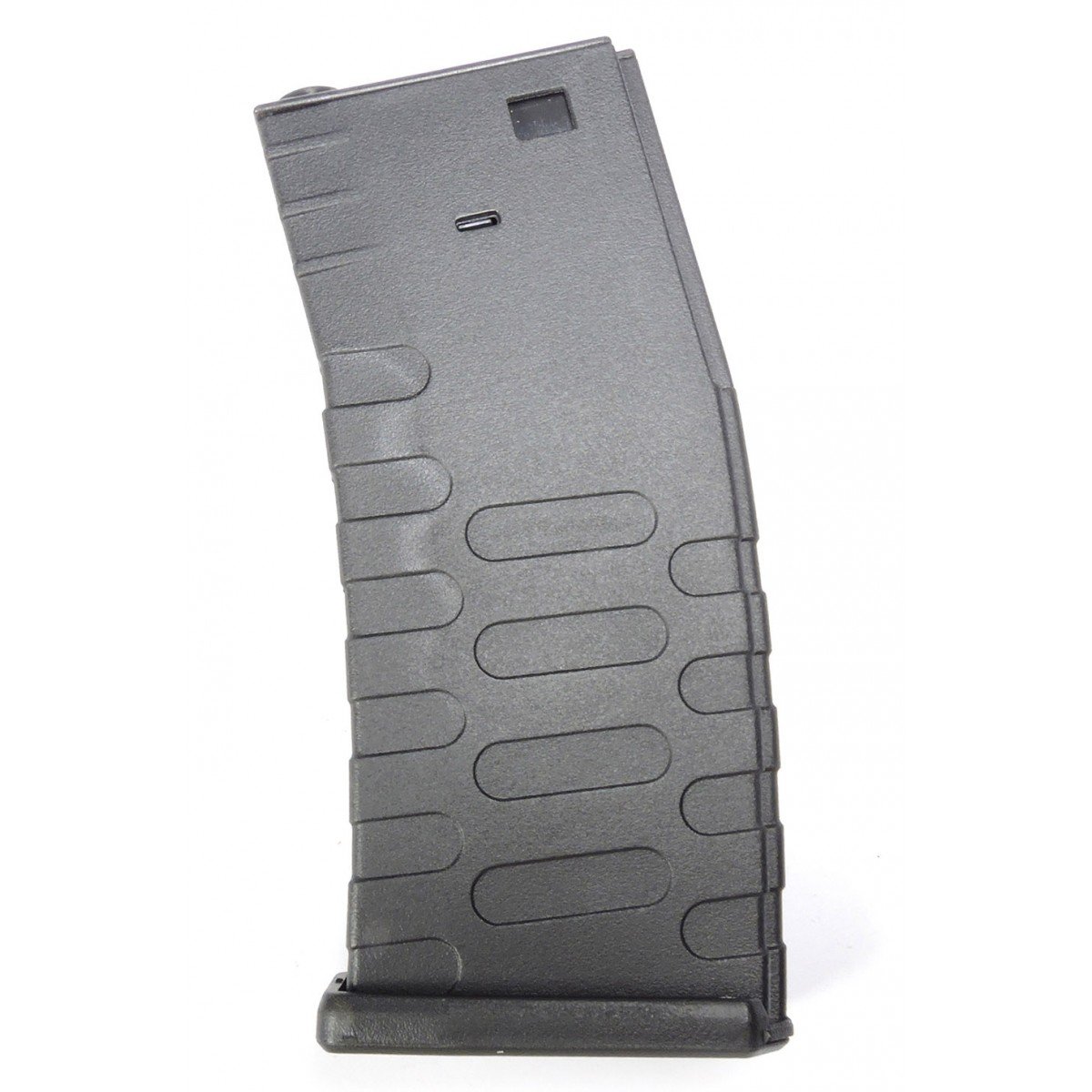 This magazine is made of POM plastic and fully compatible with aftermarket airsoft guns taking M4 magazine. The capacity of this magazine is 300rds and the internal components of the magazine are imported from Japan. Extremely smooth loading of the BB means no re-wind is necessary after one full wind up.