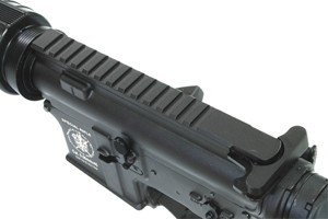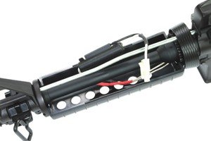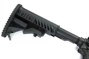 The receiver, the transport grip, the outer barrel, the stock guide, the magazine and all small elements such as the trigger, the firing selector or the shell ejector flap are made out of metal. The front grip, pistol grip and stock were made out of plastic. Access to the hop-up adjustment knob is obtained after pulling back the charging handle. The battery is housed within the front grip.
